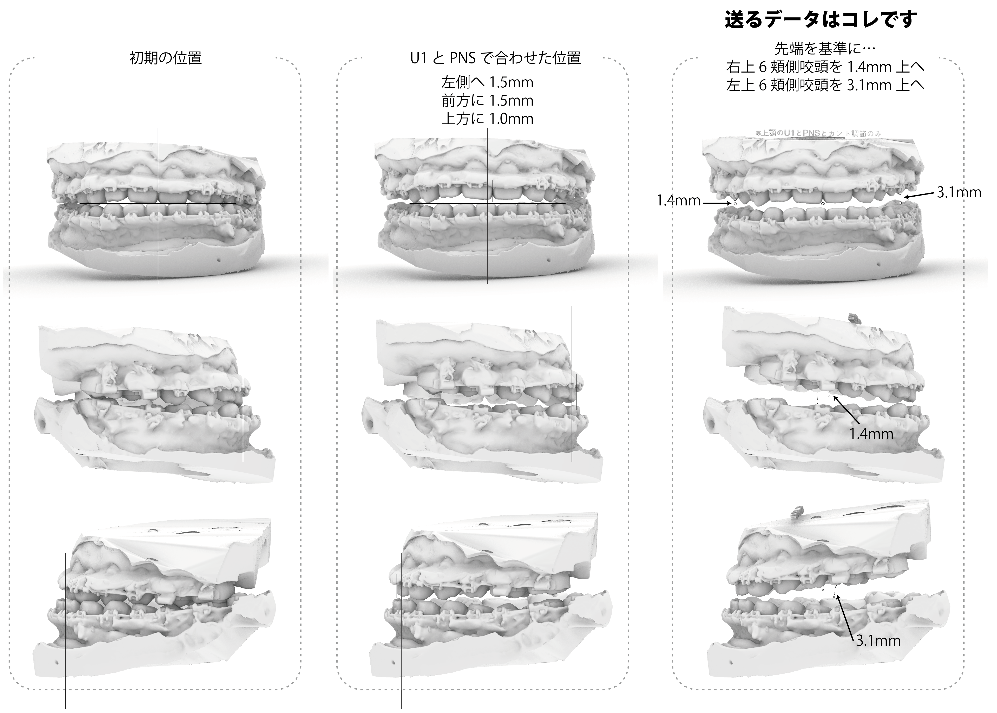 上顎だけを動かした位置を確認してもらう為のデータです。U1正中から左へ1.5mm。前方へ1.5mm。上方へ1.0mm。PNSは上方へ3.55mm、右へ1.27mm