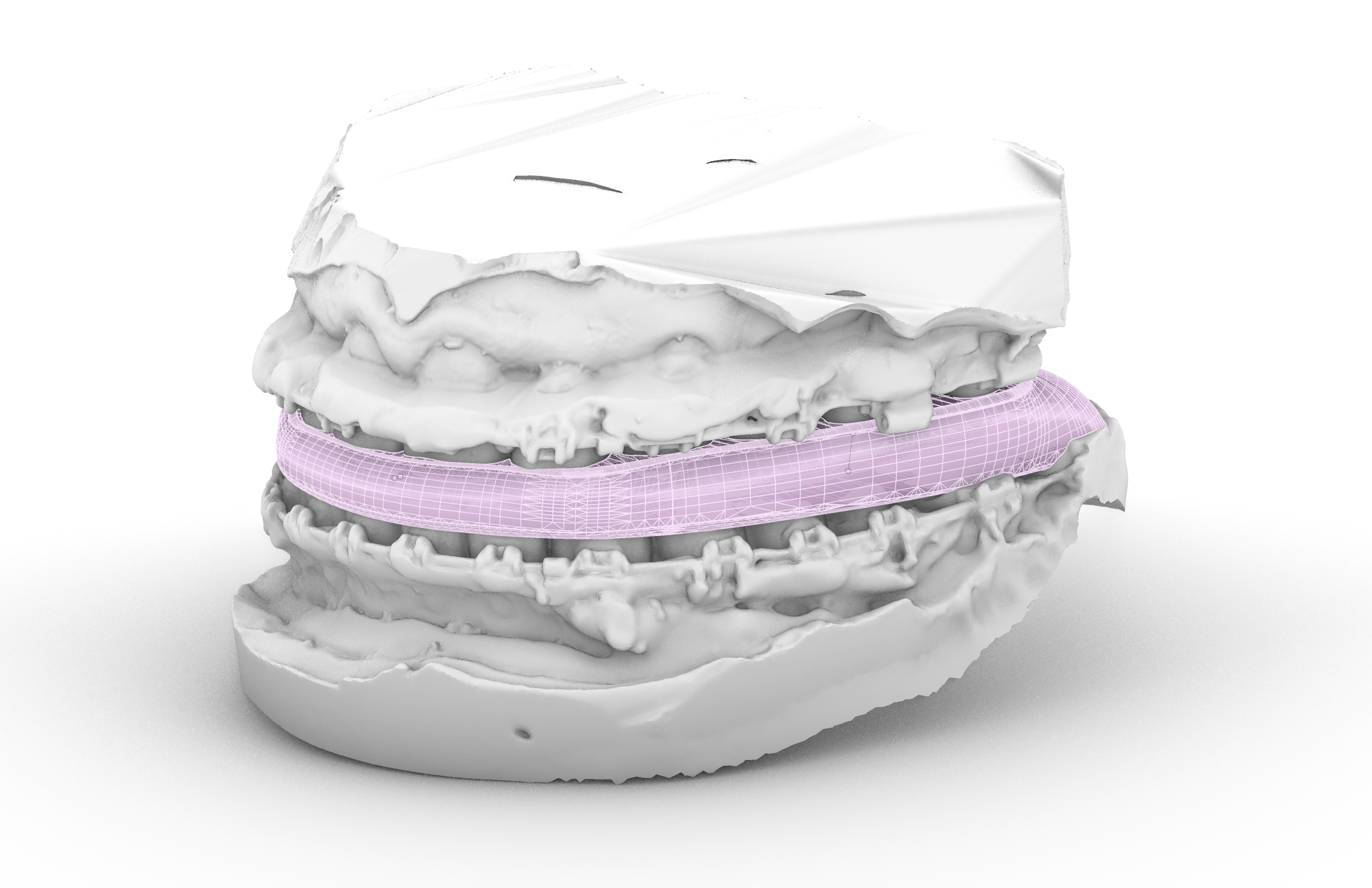 上顎だけを動かしたデータで、スプリトを作っています。歯の圧痕を深めにするため、スプリントの厚みは、ブラケットのフチ、ギリギリまで厚くしています。